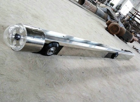 管道內(nèi)觀察機是一臺機、電、訊、光一體化的自動觀察作業(yè)小車,包括攝像觀察機頭和機身兩大部分。機頭分為旋轉(zhuǎn)和固定兩部分。機身包括變徑調(diào)節(jié)機構、機載收發(fā)信號系統(tǒng)、機載控制系統(tǒng)、蓄電池組和驅(qū)動行走機構。機頭旋轉(zhuǎn)部分內(nèi)裝攝像機和云臺,由電機帶動可向右擺動90度。機頭固定部分內(nèi)裝電機及傳動機構,能帶動機頭旋轉(zhuǎn)部分轉(zhuǎn)動360度。機身前端通過燕尾式插槽、插板與機頭連接成一體。變徑調(diào)節(jié)機構采用燕尾滑板、滑道結構,用絲杠、絲母調(diào)節(jié)機頭上、下移動處于管道中心。驅(qū)動行走機構在機身后部,其余在機身前部和中部。主要用來觀察管道焊縫內(nèi)表面缺陷和管內(nèi)有無異物及施工質(zhì)量有無問題,以便及時處理。