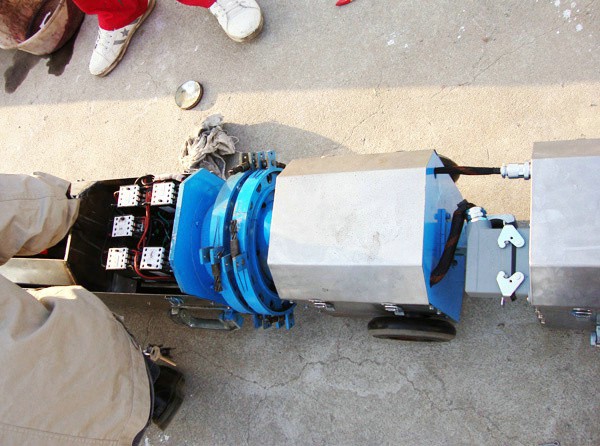 400補(bǔ)口機(jī)屬于空心工件內(nèi)表面噴涂液體及預(yù)處理設(shè)備。由驅(qū)動(dòng)、行走、除銹、吸塵、噴涂、監(jiān)控和電源七部分組成。機(jī)體為三節(jié),用鉸軸球頭組件聯(lián)接成一體。后部有行走電機(jī)驅(qū)動(dòng)主動(dòng)輪,五對(duì)從動(dòng)輪安裝在中部和前部。除銹部分由一個(gè)電機(jī)帶動(dòng)旋轉(zhuǎn)架旋轉(zhuǎn),旋轉(zhuǎn)架上安裝三個(gè)小電機(jī)帶動(dòng)鋼刷旋轉(zhuǎn)除銹。用吸塵器吸收銹塵。噴涂電機(jī)帶動(dòng)旋杯高速旋轉(zhuǎn),把液體涂料甩噴到焊口區(qū)域。能在直徑700~1000毫米管道內(nèi)深達(dá)1公里以上自進(jìn)自出。用無(wú)線(xiàn)遙控和視頻圖像直觀,完成焊口定位、除銹、吸塵、噴涂全過(guò)程焊口補(bǔ)口作業(yè)。自動(dòng)化程度和工效高,補(bǔ)口質(zhì)量好,為國(guó)內(nèi)管道施工提供了一種機(jī)、電、訊一體化自主創(chuàng)新設(shè)備,具有推廣應(yīng)用價(jià)值。
